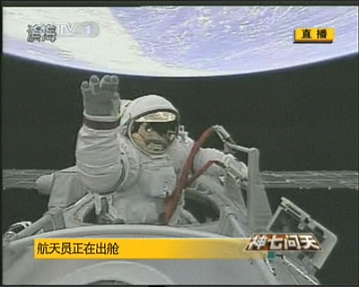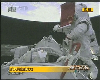 台湾东森新闻报道说,神舟七号航天员翟志刚于下午顺利在太空中迈出第一步。穿着大陆研发制造,总重120公斤,造价3000万人民币宇宙飞行服的他,以头先脚后的方式进入太空,白色宇宙飞行服上鲜艳的五星红旗显得格外醒目。