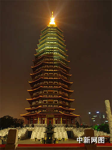 常州天宁宝塔通过灯光的变化,化身一支巨大的蜡烛,点亮星空。图片来源:中国新闻网