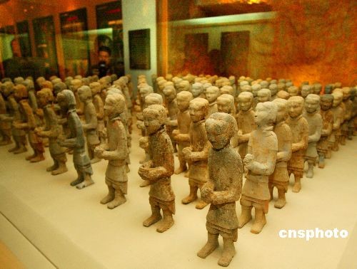 以宣传2009中国第七届花卉博览会为主题的“盛世花开丝绸路全国行”车队,3月下旬在徐州汉文化展示基地周围作主题宣传,春季来这里参观游览的游客络绎不绝。徐州汉兵马俑是徐州市东区部狮子山的楚王陵的组成部分,兵阵分布于6条俑坑,4000多件陶俑集群反映了西汉初年分封在徐州的楚王国军队整体建制和当时工匠的杰出制作工艺。中新社发 宋吉河 摄