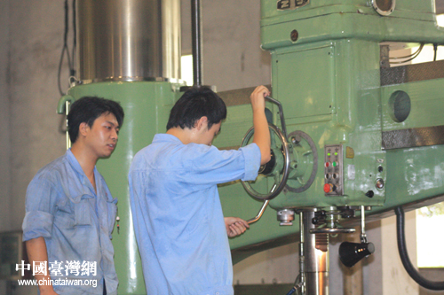 在镇江中船设备有限公司数控加工车间里,两名技术人员正在交流。(中国台湾网 肖燕 摄)