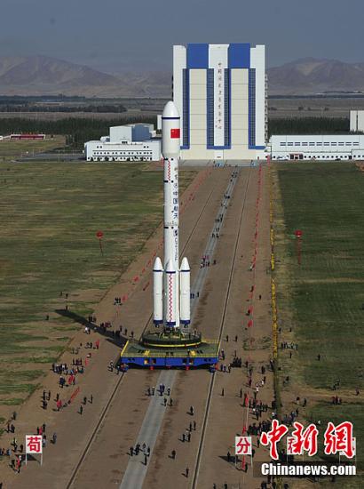 中国载人航天工程新闻发言人9月20日对外宣布,中国将于9月27日至30日在酒泉卫星发射中心择机发射“天宫一号”。目前,“天宫一号”目标飞行器、“长征二号F”运载火箭组合体已转运至酒泉卫星发射中心发射区。图为转运途中。中新社发 宿东 摄