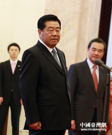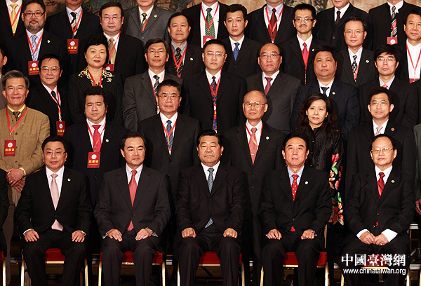贾庆林、王毅、陈云林等同全国台企联第二届会员代表合影留念。(中国台湾网 钟宝华 摄)