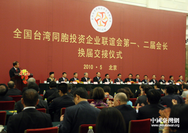 中国台湾网5月14日北京消息 全国台湾同胞投资企业联谊会第一、二届会长换届交接仪式,14日下午在人民大会堂举行。中国中央台办、国务院台办主任王毅、海协会会长陈云林等出席了仪式。(记者 钟宝华)