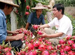 福州市闽侯县青口镇1000多亩的台湾水果种植场,引种台湾芒果、芭乐、莲雾、火龙果等8个品种,这是场主台商蔡先生(右)种植的3万多株火龙果喜获丰收(来源:香港大公报 郑杰 摄)