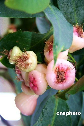 6月24日,台湾大红桃树(也称红葡萄树),在沈阳世园会百花馆里结出莲雾果,令人感到新奇而美丽。 中新社发 刘宝成 摄