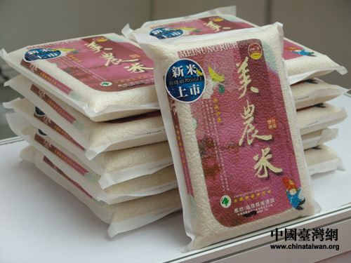 “有大米自宝岛来,品尝不亦乐乎?”,由高雄县美浓镇农会推广的“美农米”,是被当地专业评为70分以上优质大米,此次参展农会共带来130袋这样的小包装大米,每袋定价为100元人民币/2kg。(摄影:魏萌)