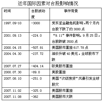 台湾是外向型经济体系,也是一个海岛型经济体系,而且社会政治环境特殊,使得台湾经济、股市受外部环境与因素影响甚大。这些外部因素包括国际经济、金融、油价与重大国际事件、经济动向入利率调整等。其中美国经济因素对台股的影响重大,今年表现尤为突出。