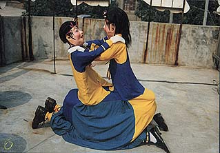 河南民间舞蹈——二鬼摔跤,又称“二鬼扳跌”,传统的民间舞蹈节目,由单人进行表演。演员穿上特制的服装,模仿两个小鬼摔跤的动作。其表演可在舞台上,也可以在场地上进行,有的还在桌子上进行。用木头刻绘成两个鬼头,钉上两顶帽子,衣服有两个棉袄外套、两个大褂,衣服内钉上用木板做的肩和腿。板四角4根绳子,前两根系于演员腰部。演员两只手拿板,板上安有假脚和鞋子,上肢四臂是假的,抱着不动,下肢四腿是演员的两腿和两臂。舞蹈的制作十分巧妙,动作幽默诙谐,逗人发笑,很受群众欢迎。