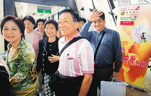 刚刚走下飞机的台湾旅客。 潘索菲摄 本报北京9月29日讯 综合本报和新华社消息:两岸中秋包机今天启动。上午11时,台湾长荣航空公司的BR1712航班,由台北起飞,13时25分顺利抵达上海浦东国际机场。这是自今年6月两岸业者就客运包机节日化达成共识后,首次执行的首班包机,标志着两岸客运包机节日化成功迈出第一步。