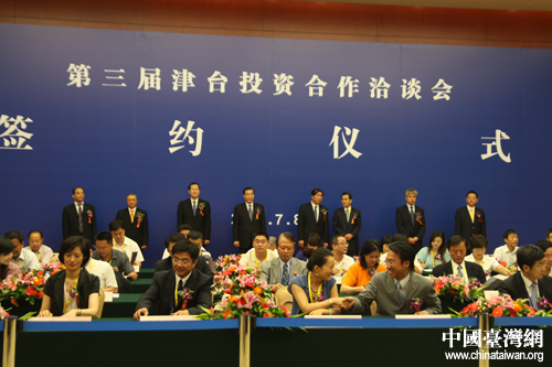 中国台湾网7月8日天津消息 第三届津台投资合作洽谈会投资项目签约仪式8日在天津梅江会展中心举行。本届津台投资合作洽谈会共签订台商投资项目23个,签约项目投资总额达140亿元人民币。