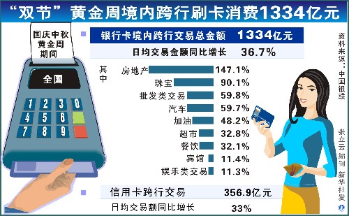 图表:“双节”黄金周境内跨行刷卡消费1334亿元 新华社发