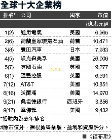 据香港《文汇报》消息,《福布斯》根据综合评分定出是项排名,营业额、盈利、资产和市值占同等比重。三甲位置分别由美国通用电气、荷兰皇家蚬壳石油和日本丰田汽车夺得,十大位置中,美国占了5席。