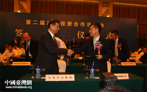 中国台湾网7月30日天津消息 第二届津台投资合作洽谈会投资项目签约仪式今日在天津赛象酒店举行。天津市委副书记、滨海新区工委书记何立峰、副市长任学锋,市政协副主席刘长喜,国台办经济局局长徐莽,台湾工商协进会理事长黄茂雄等出席签约仪式。签约项目投资总额超过110亿元人民币。