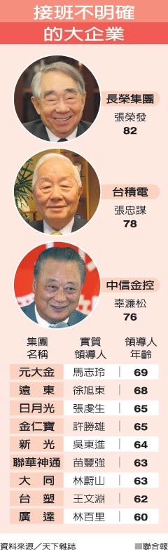 台湾前30大企业中,有12家企业领导人超过60岁,其中3家超过70岁,例如台积电张忠谋、中信金辜濂松、长荣集团张荣发等。