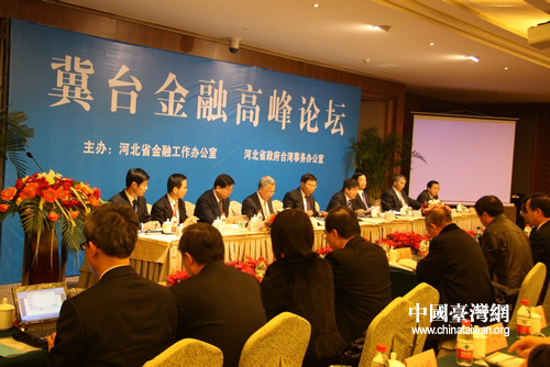 中国台湾网11月30日石家庄消息 由河北省金融工作办公室、河北省政府台湾事务办公室主办的“冀台金融高峰论坛”,于11月29日下午在石家庄市内举行。以台湾金融服务业联合会总会理事长许嘉栋为首的“台湾金融团”一行18人,与河北省银行、保险、证券等金融行业的高层负责人一起,相互介绍金融业发展状况,展望冀台金融交流合作之无限可能。