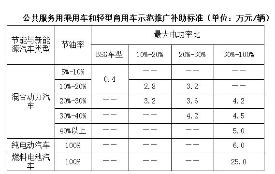 对乘用车和轻型商用车,混合动力汽车根据混合程度和燃油经济性分为5档,最高每辆补贴5万元;纯电动汽车每辆补贴6万元;燃料电池汽车每辆补贴25万元。