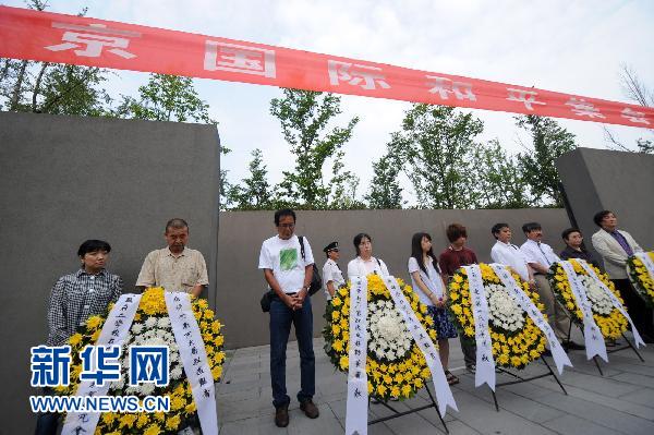 8月15日,参加和平集会的日本友人向南京大屠杀遇难者敬献花圈。当日,二战被日本强掳劳工遇难者家属、日本友人和南京各界人士等300多人在侵华日军南京大屠杀遇难同胞纪念馆的和平公园举行和平集会,祭奠30万南京大屠杀遇难同胞,纪念中国人民抗日战争胜利65周年。新华社记者 韩瑜庆 摄