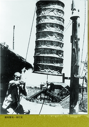 在陈列的一张图片上,负责挂起警报球的工作人员,正用力地拉动麻绳将两个相连的球体挂上木杆的顶端。张荣祥说,这张照片上的警报球是抗战时期的国军防空部队用来进行空袭报警的,根据日本轰炸机距离的远近,依次挂上不同的个数,陪都市民在远处看到后就能判断危险程度。这个挂灯笼的高地现在就叫“红灯坝”。