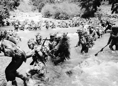 身披伪装的中国士兵在前往滇西怒江前线的路上,他们将在那里阻截日军的进犯。