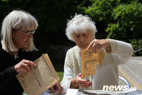 6月26日,在丹麦第二大城市奥胡斯郊区的一栋海滨别墅里,抗战期间在南京救助和保护了近2万名中国难民的丹麦友人贝恩哈尔·辛德贝格的妹妹比滕·安诺生(右)和外甥女玛丽安娜·安诺生向记者展示有关南京大屠杀的史料。新华社发(林淼摄)