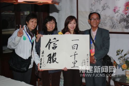 参加“华夏园丁大联欢——2008海西之旅”的澳门老师在福州交流教育经验,并题写“信服”“一日千里”等字送给福州实验小学。