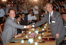 29日上午10点52分,汪道涵、辜振甫分别代表海协和海基会在《汪辜会谈共同协议》等四项协议上,郑重地签署了自己的名字。对此,辜老先生感慨地表示,“今天上午签署的协议,为两岸事务性交流掀开了新的一页”,“使两岸关系跨出了历史性的一步”,“为两岸未来的发展打下了良好的基础”,“对发展两岸关系、两岸交流秩序化将是一座里程碑”。
