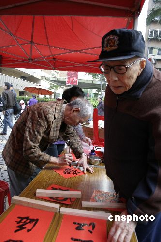 二00七台北眷村文化节开幕,老人们在活动现场书写对联。 中新社发 陈国华 摄