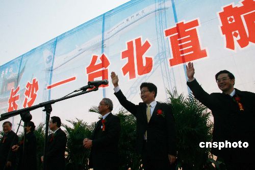 一月十五日下午,满载一百七十名乘客的厦门航空MF889航班从长沙黄花机场起飞,湖南长沙至台北客运直达航班正式开通。湖南省委书记张春贤(右二)、湖南省长周强(右一)、海协会副会长张铭清(右三)出席首航仪式。长沙至台北航线目前定为每周四一班,在长沙起飞时间为下午三点五十,六点抵达台北;返程起飞时间为下午七点,九点二十分到达长沙。 中新社发 刘双双 摄