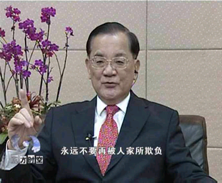 白岩松:今年正好是抗战胜利六十周年这样一个纪念年。因为前一段时间我去台湾的时候也看到,在国民党的总部,搞了整个抗战的纪念展览;包括您也办了很多的活动,包括座谈会啊等等。您为什么要举办这样多的活动来纪念这样的一个年份?