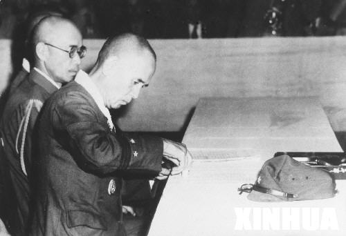 | 1945年9月9日,中国战区日军投降签字仪式在南京举行,图为中方受降代表何应钦(前右二)在日军降书上签字。 新华社发 |
