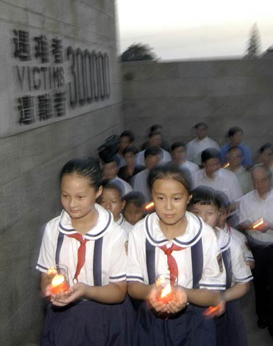 当日是抗日战争胜利60周年,南京1500余名社会各界群众来到南京大屠杀遇难同胞纪念馆,手持蜡烛绕纪念馆一周后,将蜡烛摆放在铭刻着遇难者名单的纪念墙前,祭奠30万遇难同胞的亡灵。