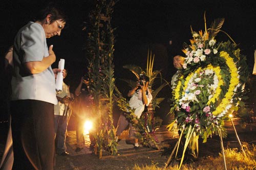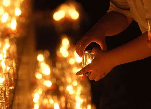 8月15日,前来祭奠的群众将蜡烛置于遇难者名单墙边。当日是抗日战争胜利60周年,南京1500余名社会各界群众来到南京大屠杀遇难同胞纪念馆,手持蜡烛绕纪念馆一周后,将蜡烛摆放在铭刻着遇难者名单的纪念墙前,祭奠30万遇难同胞的亡灵。