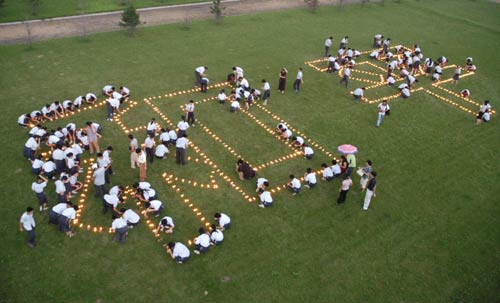 8月15日,哈尔滨市的孩子们用点燃的蜡烛组成“和平”二字。当日傍晚6点,近万名各界群众聚集在哈尔滨市平房区侵华日军第七三一部队罪证陈列馆,举行祈祷和平大型活动,纪念中国人民抗日战争胜利暨世界反法西斯战争胜利六十周年。