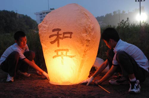 8月15日,在哈尔滨参加祈祷和平大型活动的人们点燃孔明灯。