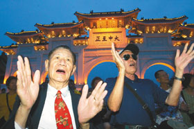 据台媒报道,时值抗战胜利与台湾光复60周年之际,上百位参与庆祝活动的民众,昨天傍晚齐聚台北中正纪念堂“大中至正”牌楼门口,高唱《八百壮士》、《大刀进行曲》、《空军军歌》等。