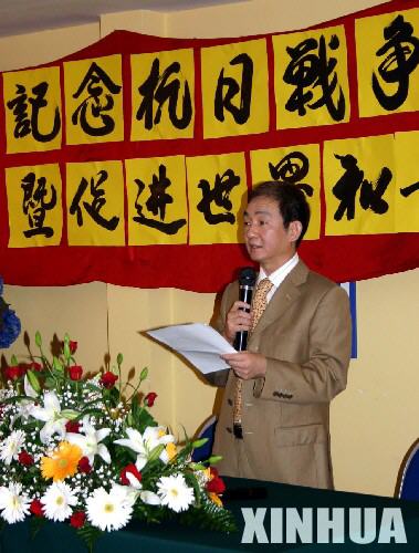 8月28日,在意大利首都罗马,中国驻意大利使馆公使衔参赞张利民在旅意华人华侨举办的纪念抗日战争胜利60周年大会上发表讲话。 新华社记者杨爱国摄