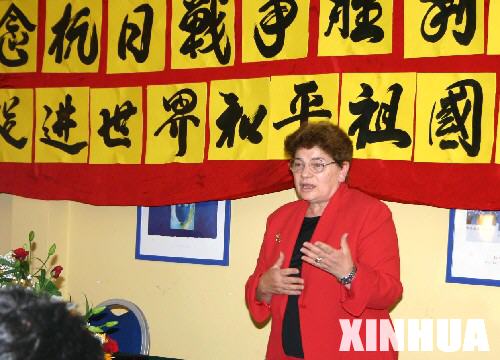 8月28日,在意大利首都罗马,意中友协主席曼齐尼女士在旅意华侨华人举办的纪念抗日战争胜利60周年大会上发表讲话。 新华社记者杨爱国摄