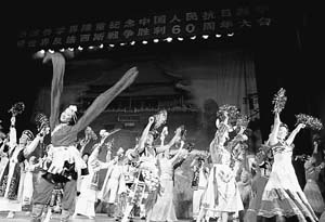 为纪念中国人民抗战胜利60周年,法国华侨华人4日举行文艺演出。图为长江艺术团歌舞表演“爱我中华”。 本报记者 廖先旺摄 |