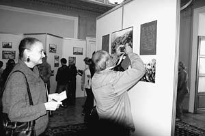 我驻俄使馆5日举行纪念中国人民抗战胜利60周年图片展。图为俄罗斯观众在观看图片。 |