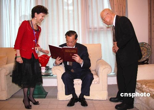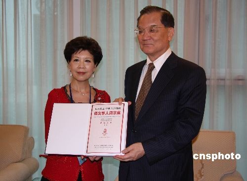 图为胡葆琳团长(左)向连战(右)赠送纪念品《杰出华人与京奥》