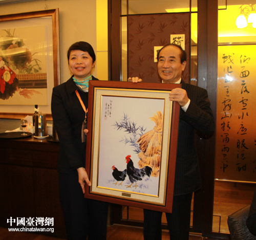 2011年4月18日,台湾十大杰出青年基金会欢送大陆高校师生参访团一行,图为十大杰出青年基金会王金平董事长与中国宋庆龄基金会联络部陈爱民部长互换礼物。(中国台湾网 杨永青 摄)