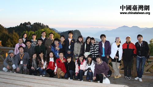 2011年4月15日,大陆高校师生乘坐小火车并于观看阿里山日出后合影留念。(中国台湾网 杨永青 摄)
