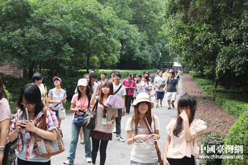 中国台湾网7月8日南京消息 参加“追寻历史的足迹”之“成就之旅”的两岸青年今天来到古城南京,在暑期难得的雨后初霁的天气里参访了著名的南京大学。