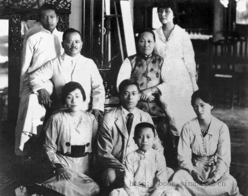 1917年下,宋美龄自美国返国后摄于上海宋寓。前排:三子宋子安(1906年生);二排左起:长女宋蔼龄(1889年生)、长子宋子文(1894年生)、次女宋庆龄(1893年生);后排左起:次子宋子良(1899年生)、父亲宋嘉树、母亲倪桂珍、三女宋美龄(1897年生)。