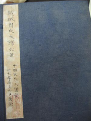 《越城周氏支谱》,编号20号,6集,共有6册,清周以均撰,清周锡嘉编订,清光绪3年(1877)宁寿堂木活字本。始迁祖周逸斋,明正德间徙居越城竹园桥。礼集为序、谱例、渊源考、周敦颐至吴江周德之世系表,乐集载逸斋以下世系表。此为鲁迅家族之谱,因修于鲁迅出生之前,故谱中仅载有鲁迅、周作人的父亲周凤仪。据了解,该家谱当时仅印二十部,编号由周氏子孙收藏。此书分礼、乐、射、御、书、数六集,述周氏渊源、世系、世表、家传等,考据精当,史料可靠,文笔。该家谱有书套,上有周作人“越城周氏支谱,14世作人谨藏,民国廿七年壬月六日题签”。