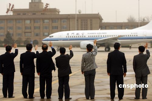 四月十七日下午,中国国民党荣誉主席连战携夫人离开北京飞往福建,开始福建的祭祖之旅,中共中央台办主任陈云林到机场送行。作者:盛佳鹏