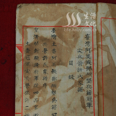 《台湾土番阿美族邓州垦兵籍冠军尖兵营许氏家谱》不但追根溯源记载了先祖轶事,而且详细记载了先祖追随民族英雄郑成功抗击荷兰收复台湾的史实。清朝册封许氏尖兵营张许二姓太始祖,冠军尖兵营许氏原籍台湾昭穆,张许历代同辈同字。