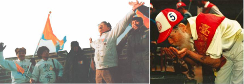 上世纪八十年代,台湾民间涌起“老兵返乡探亲”运动,老兵身挂“回家”标语的照片。