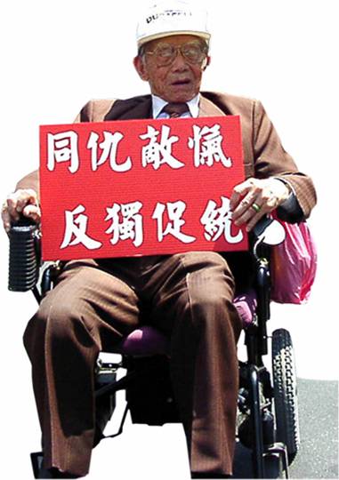 An elder in his 90s sat in a wheel chair to join a great procession against Taiwan Independence and for reunification.