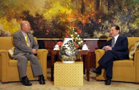 2002年7月7日,海协会会长汪道涵在沪会见了由台湾知名人士、“山盟”总干事长许信良率领的台湾“促进两岸‘三通’访问团”一行。图为海协会会长汪道涵会见“山盟”总干事长许信良。